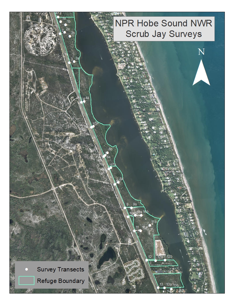 This reference provides the locations of Scrub-Shrub survey transects associated with vegetation surveys and Florida Scrub-Jay surveys on Hobe Sound National Wildlife Refuge.